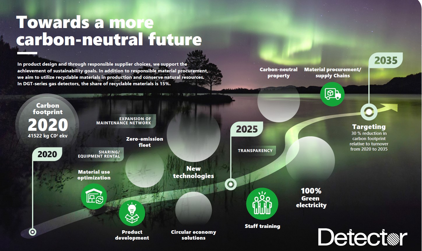 Detector Ltd. har utarbetat en koldioxidplan ”Mot koldioxidneutralitet” fram till år 2035. Koldioxidavtrycket bildas av följande områden: