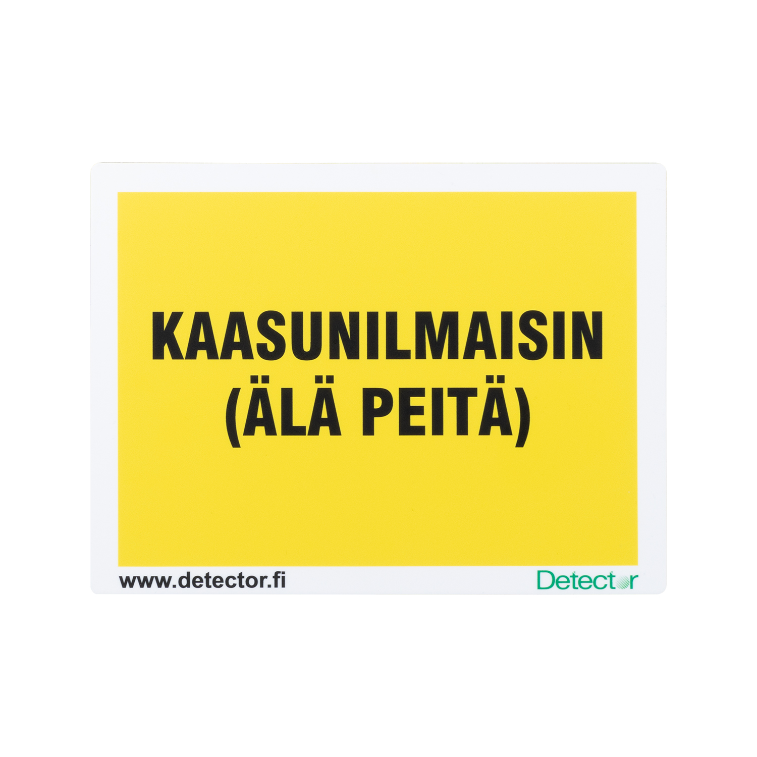 Kaasunilmaisin-opastekyltti asennettavaksi kaasunilmaisimen viereen. Laadukas, itseliimautuva tarra kyltin takana varmistaa helpon ja nopean asennuksen. Materiaali: alumiini / komposiitti Mitat: 15 cm x 20 cm